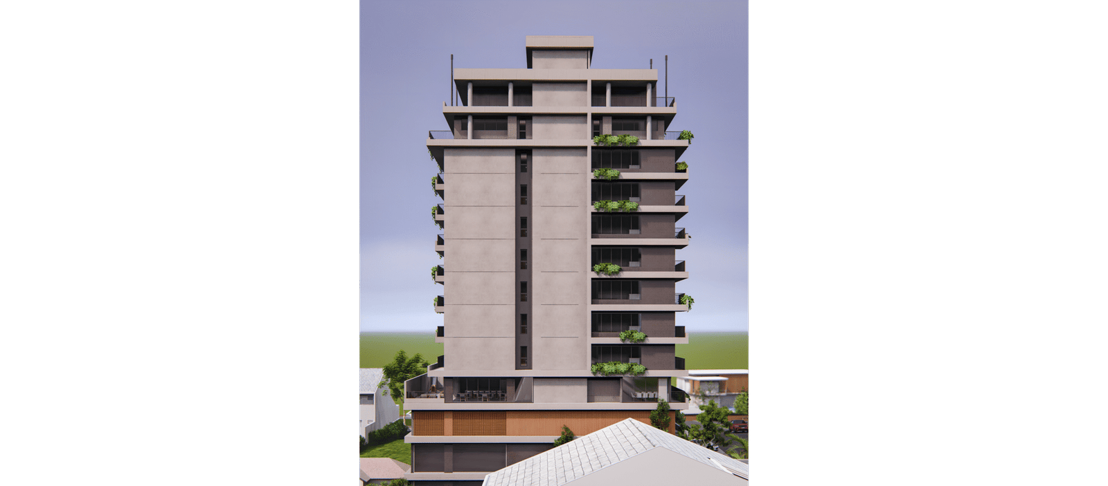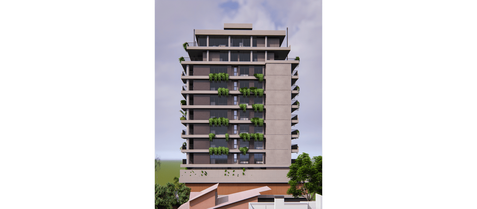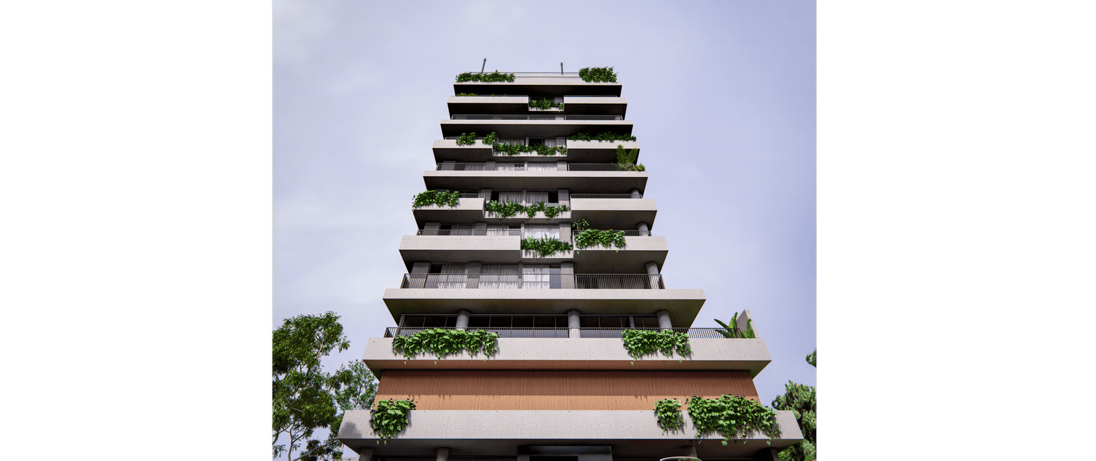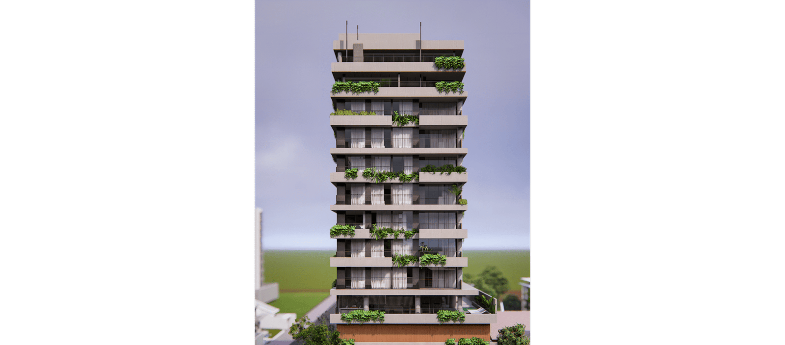 A implantação foi pensada para explorar o potencial máximo do terreno: acessos independentes para as garagens, térreo ativo com uma sala comercial destacada na esquina e um térreo acolhedor, marcado por materiais naturais e um paisagismo que convida a entrar. A volumetria respeita os recuos e condicionantes do bairro, transformando limites em soluções criativas — o paisagismo do térreo se projeta verticalmente pela fachada, com floreiras e jardins em todos os pavimentos, oferecendo a cada unidade um contato direto com a natureza.