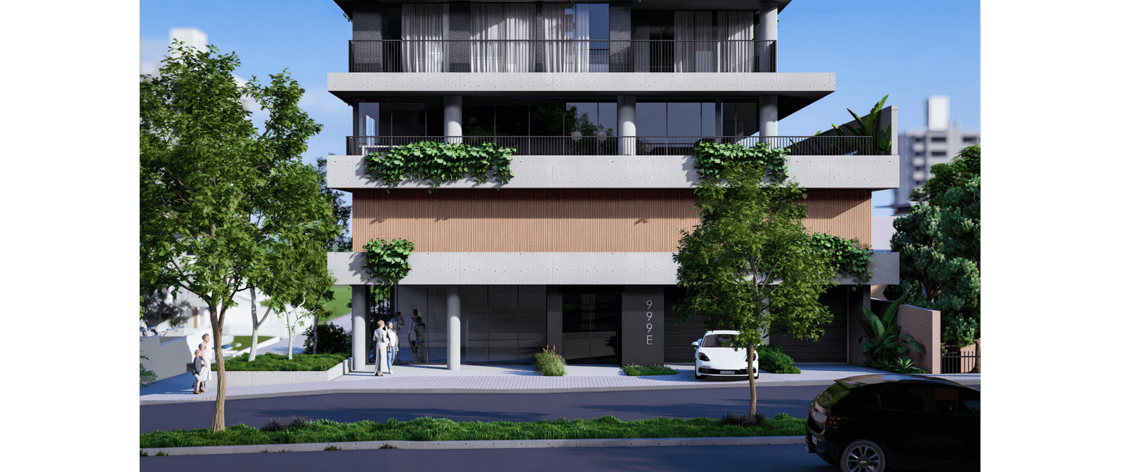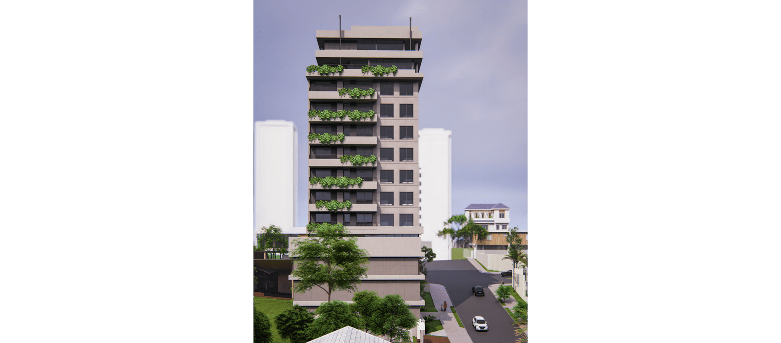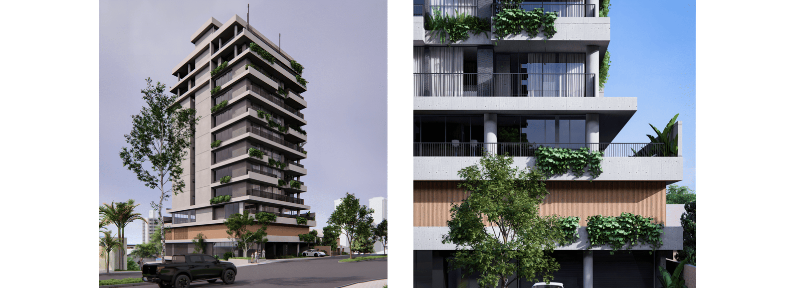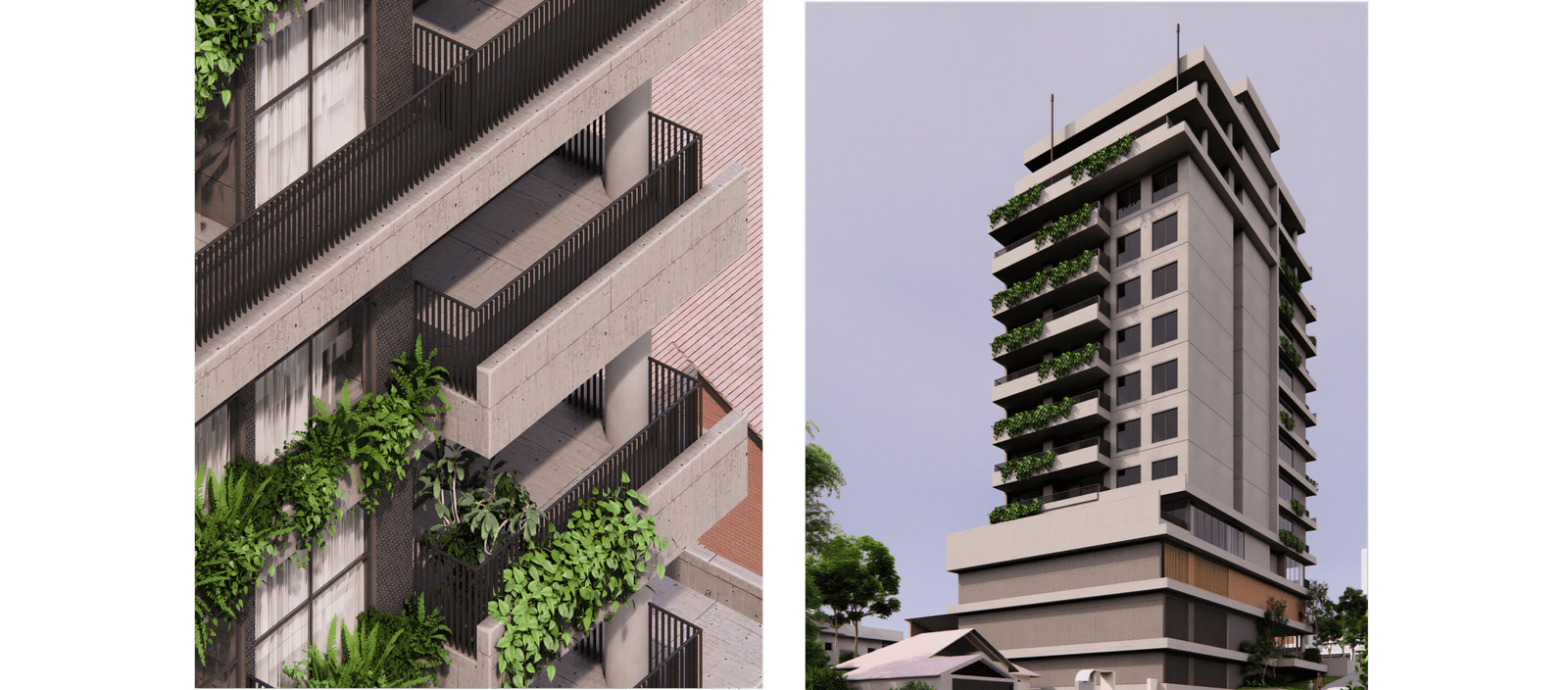 A implantação foi pensada para explorar o potencial máximo do terreno: acessos independentes para as garagens, térreo ativo com uma sala comercial destacada na esquina e um térreo acolhedor, marcado por materiais naturais e um paisagismo que convida a entrar. A volumetria respeita os recuos e condicionantes do bairro, transformando limites em soluções criativas — o paisagismo do térreo se projeta verticalmente pela fachada, com floreiras e jardins em todos os pavimentos, oferecendo a cada unidade um contato direto com a natureza.